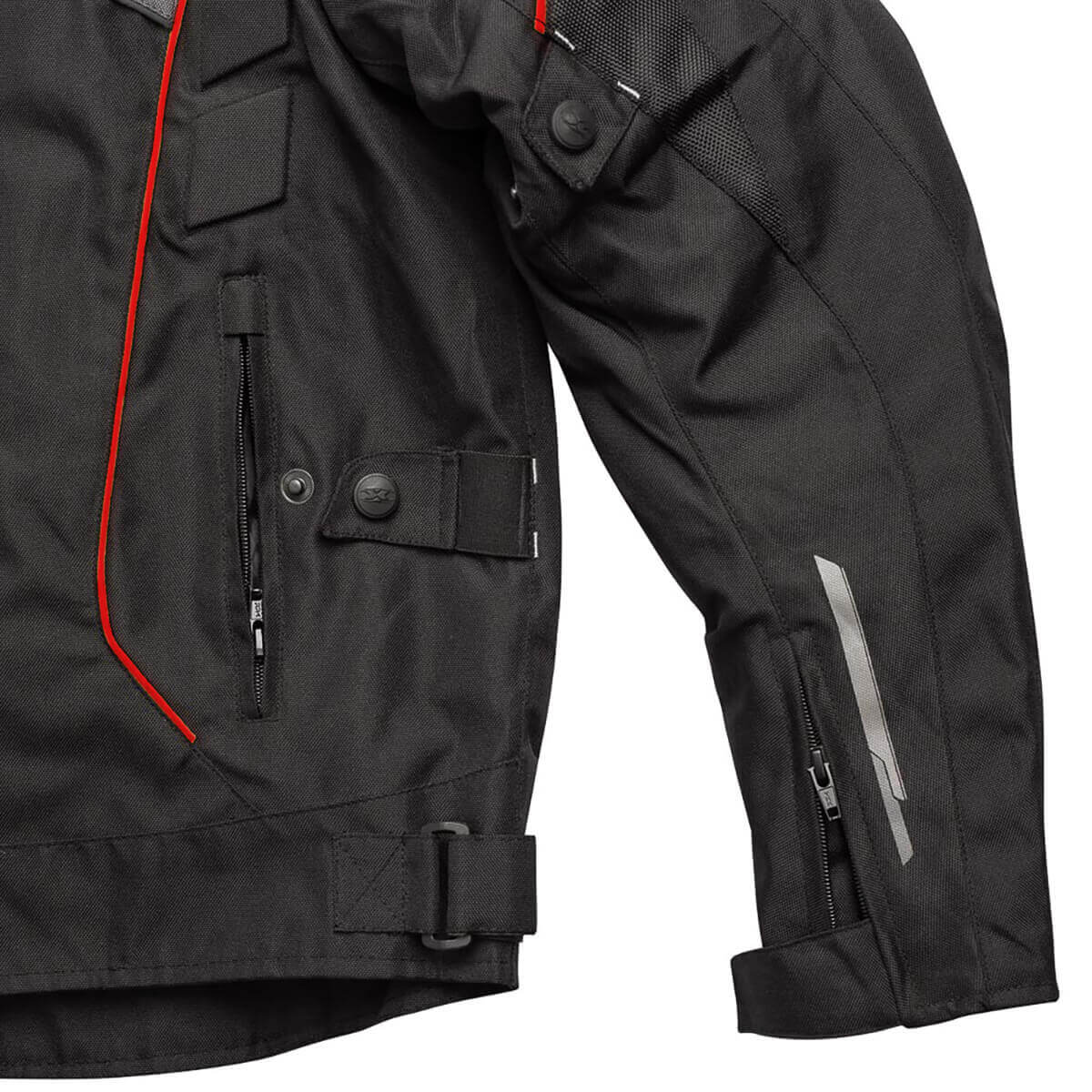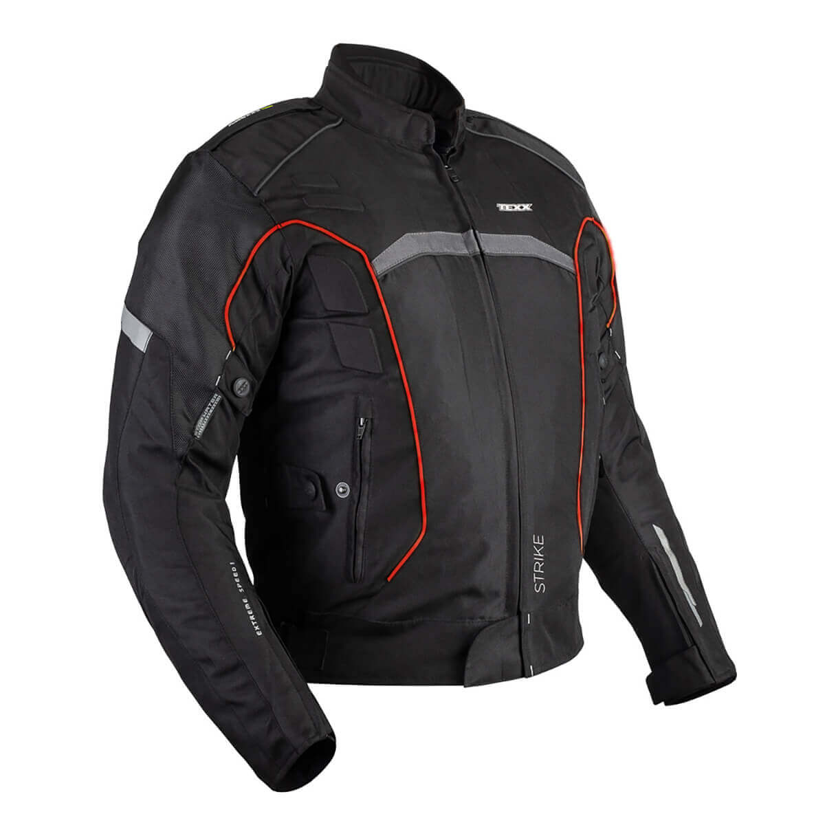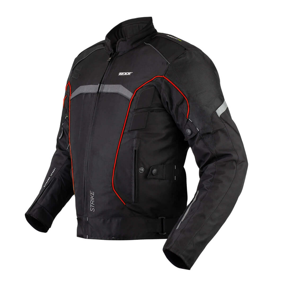 Descrição: JAQUETA PARA CONDUTORES E PASSAGEIROS DE MOTOCICLETAS MODELO: NEW STRIKE V2 GÊNERO: MASCULINO MATERIAL: POLIÉSTER FORRO: COMPLETO MARCA: TEXX COR: PRETA E VERMELHA