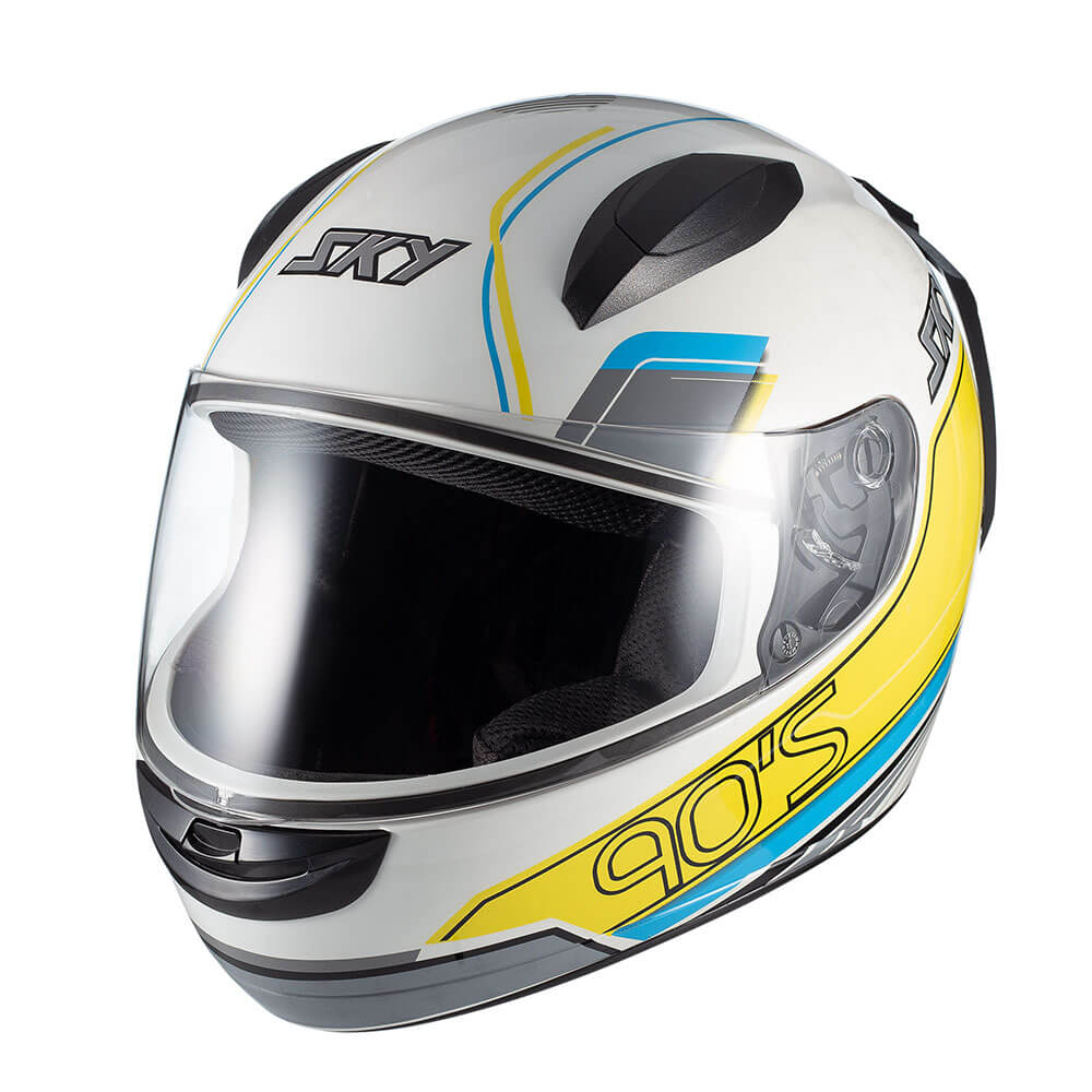 Localizar RevendedorNome do Produto: CAPACETE SKY ANOS 90 BRANCO AZUL C/ AMARELO