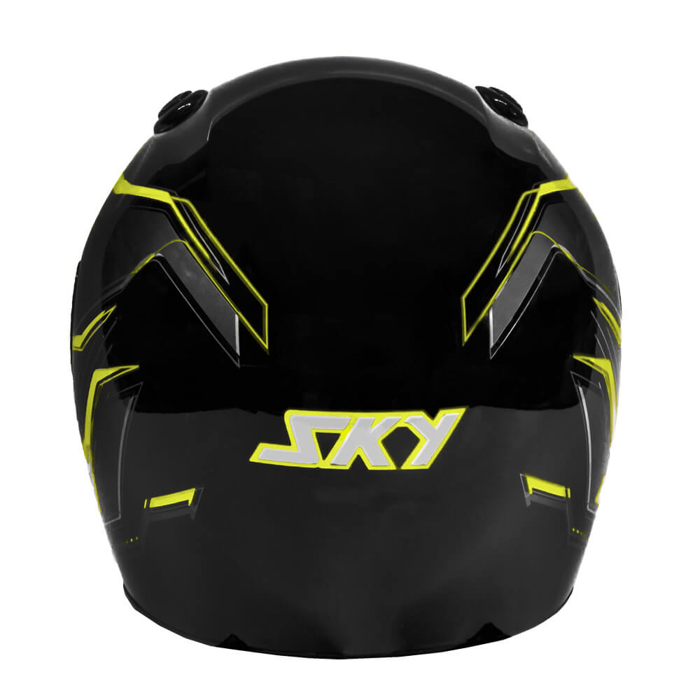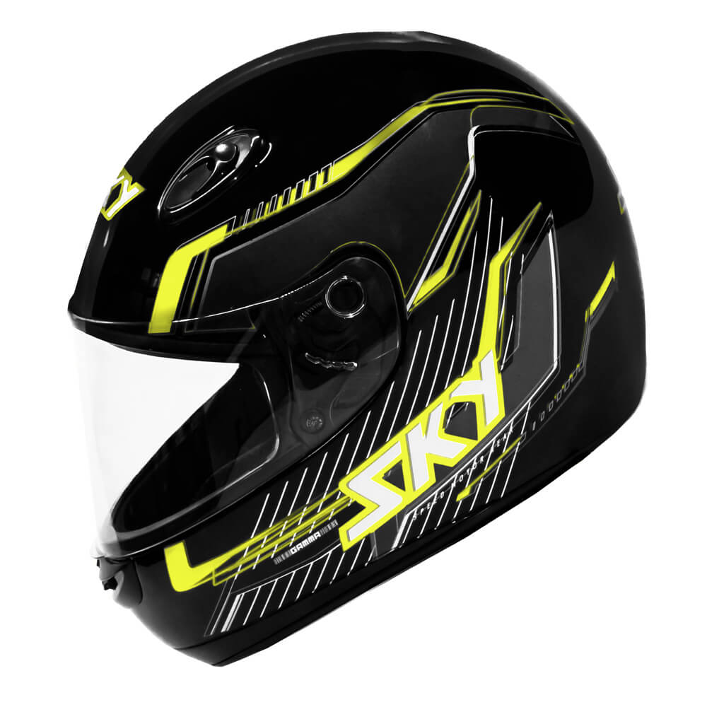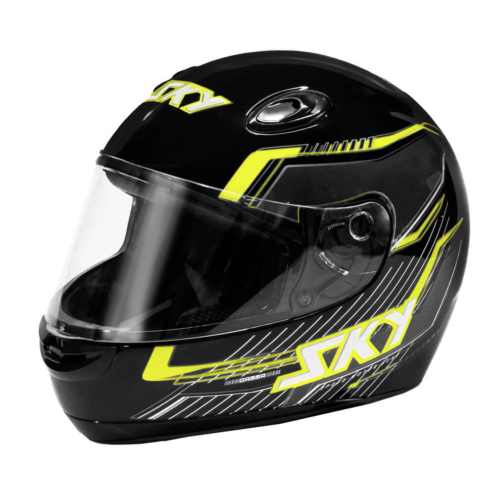 Localizar RevendedorNome do Produto: CAPACETE SKY GAMMA PRETO BRILHO, TRANF VERDE/AMARELO