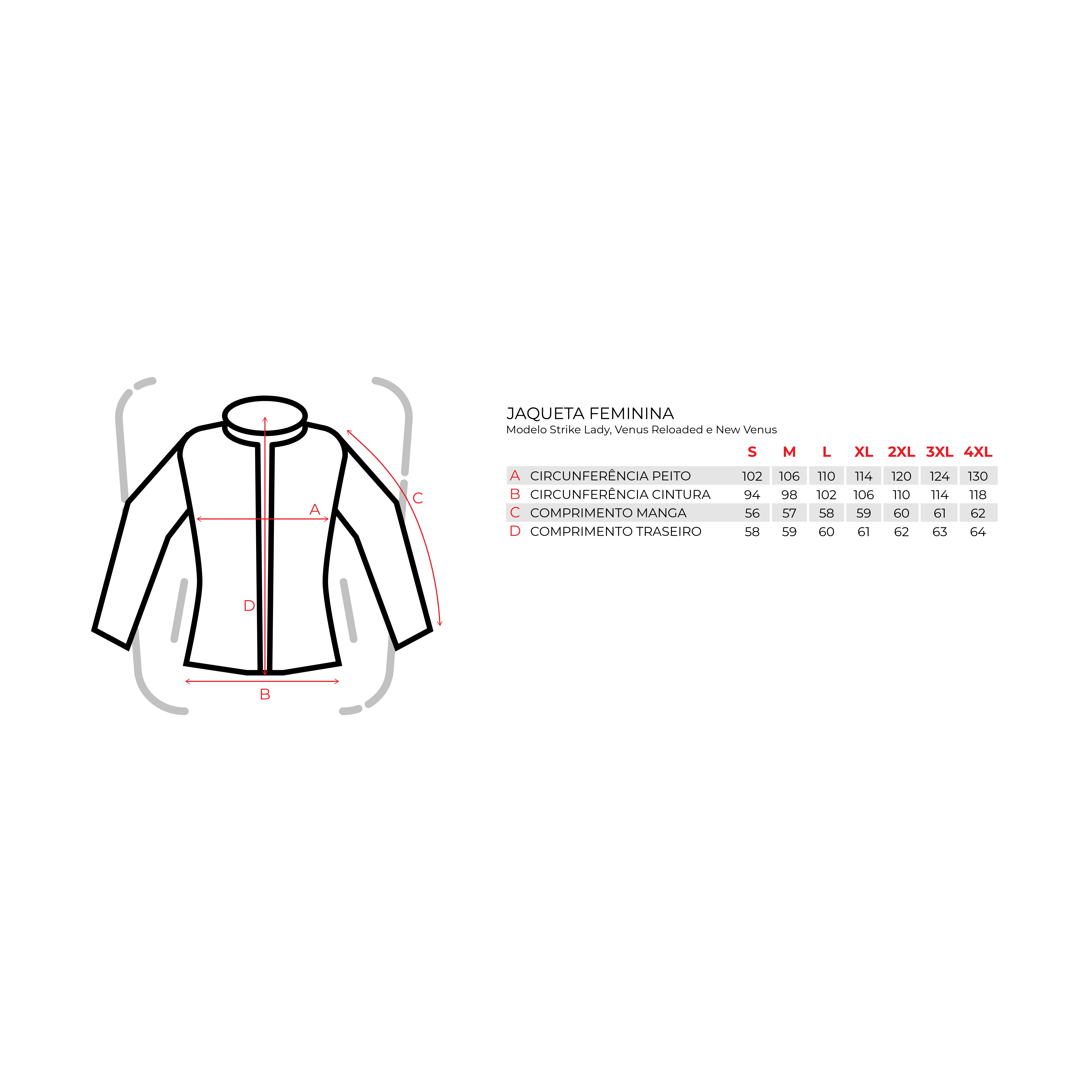 Tamanhos: S, M, L, XL, 2XL, 3XL e 4XL