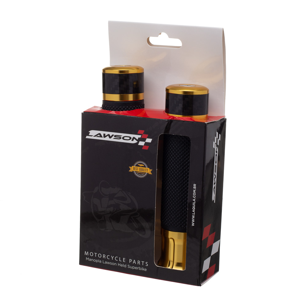 Descrição: MANOPLA LAWSON HELD PLUS SUPERBIKE C/ PESO E GUIA DO CABO UNIVERSAL GRIP E ALUMINIO DOURADO