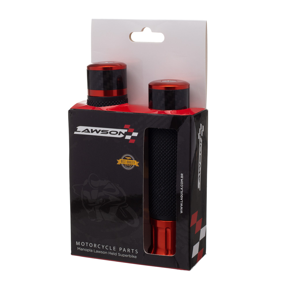 Descrição: MANOPLA LAWSON HELD PLUS SUPERBIKE C/ PESO E GUIA DO CABO UNIVERSAL GRIP E ALUMINIO LARANJA