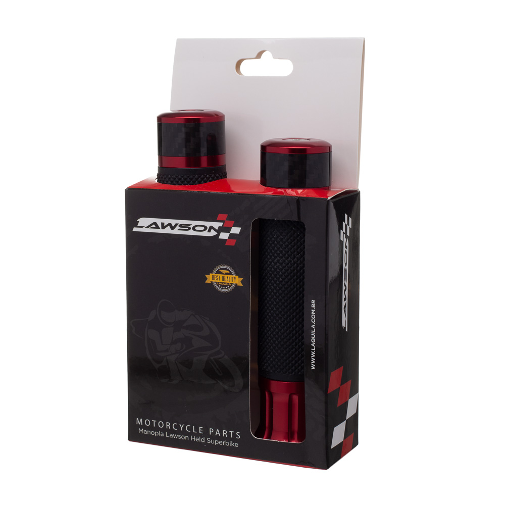Descrição: MANOPLA LAWSON HELD PLUS SUPERBIKE C/ PESO E GUIA DO CABO UNIVERSAL GRIP E ALUMINIO VERMELHA